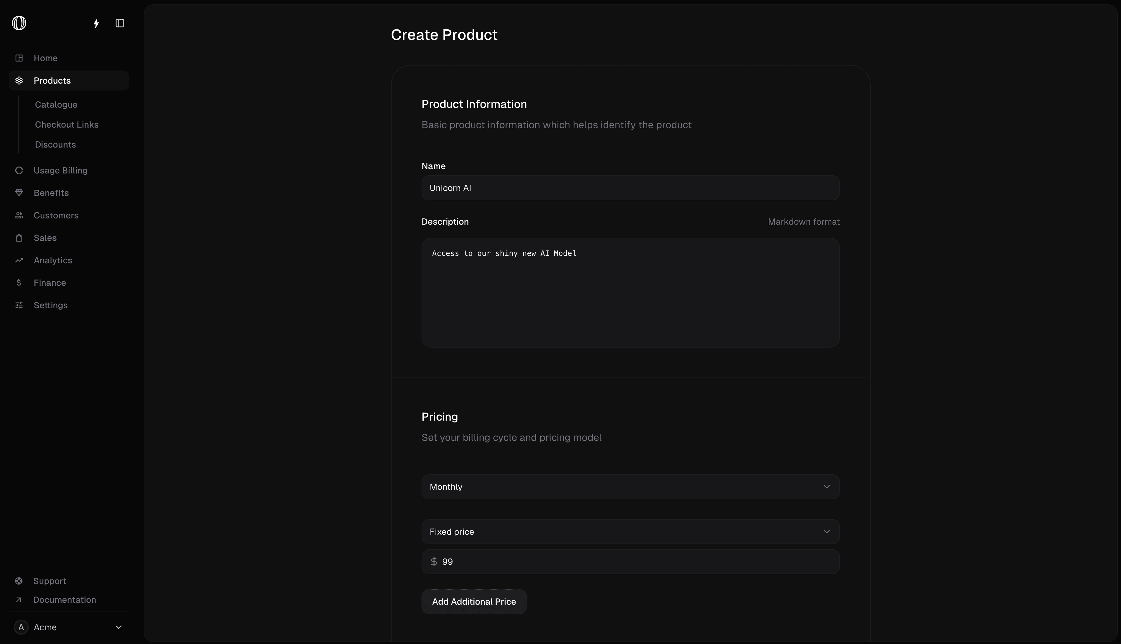 Billing cycle and pricing type cannot be changed after the product is created.