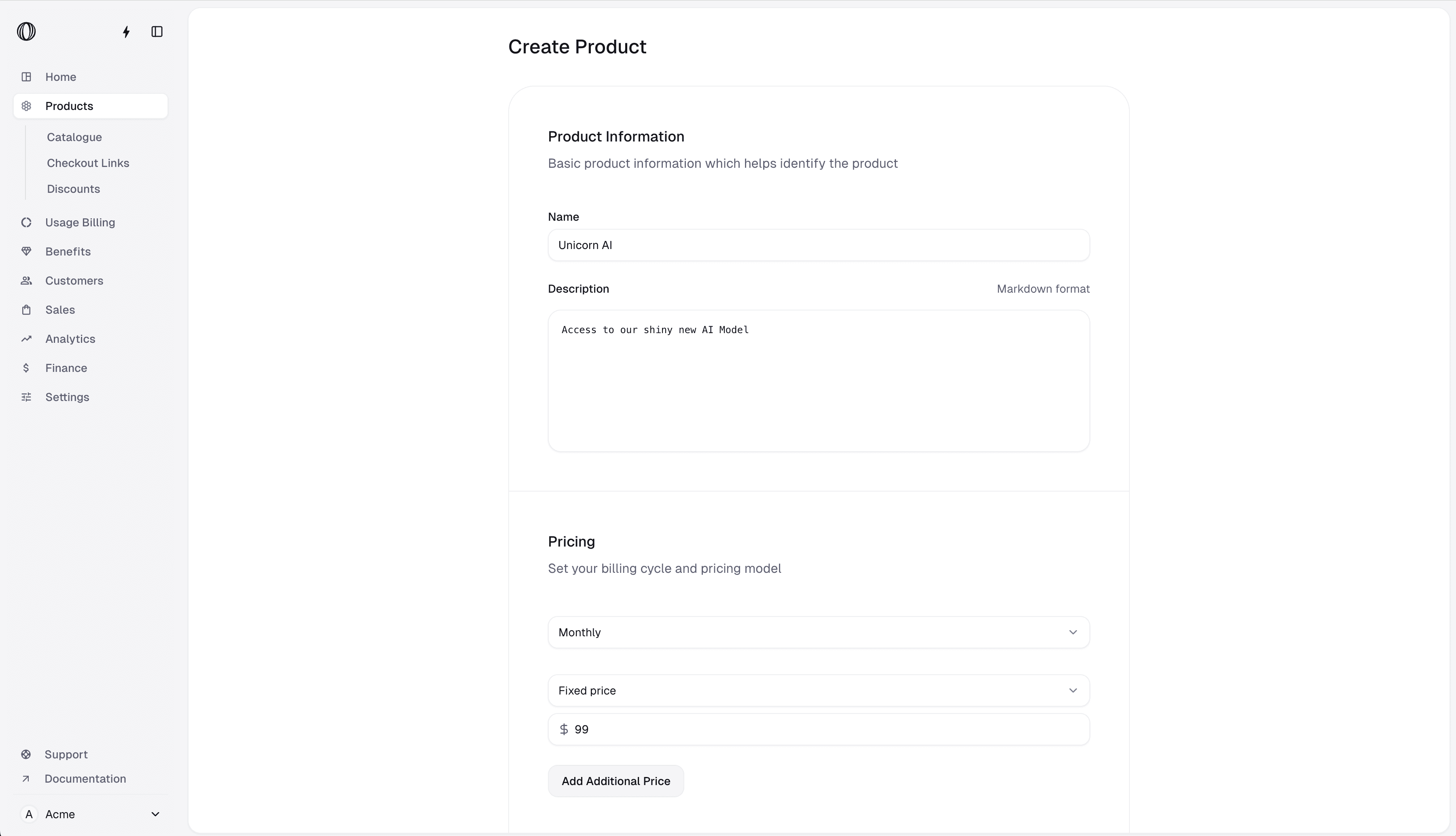 What if I want both a monthly and yearly pricing?Polar has a unique approach to what the industry typically calls variants. Each product has a single pricing model, but you can create multiple products with different pricing models, and showcase them both at checkout.