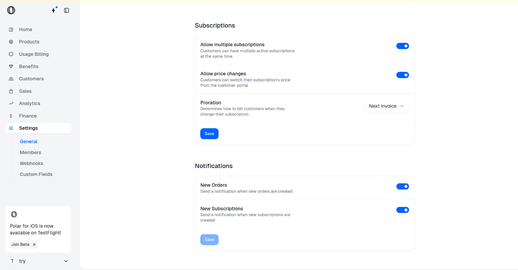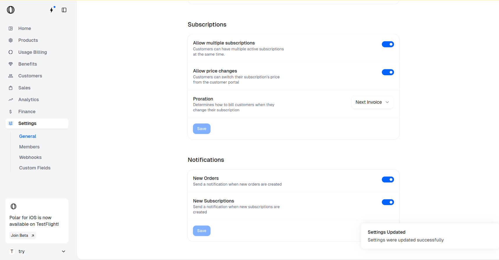 https://polar.sh/dashboard/${org_slug}/settingsScroll down to Subscriptions section.