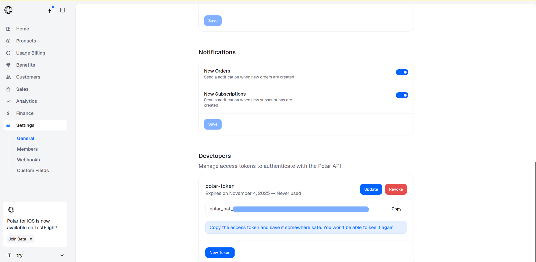 After creating your access token, you will be able to view it. Please copy and save your access token.