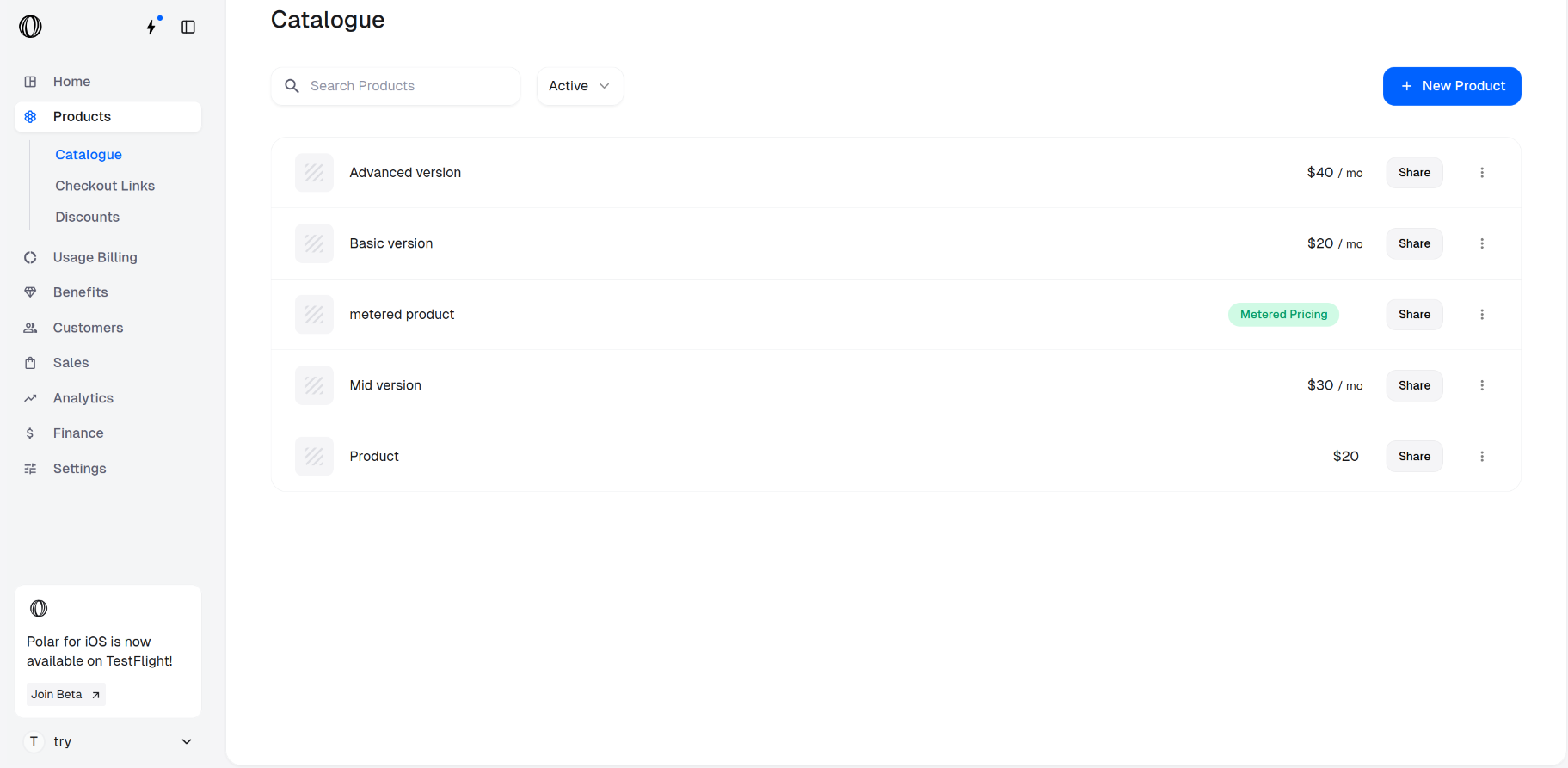 In the Polar dashboard sidebar, navigate to Products > Catalogue for your organization.
