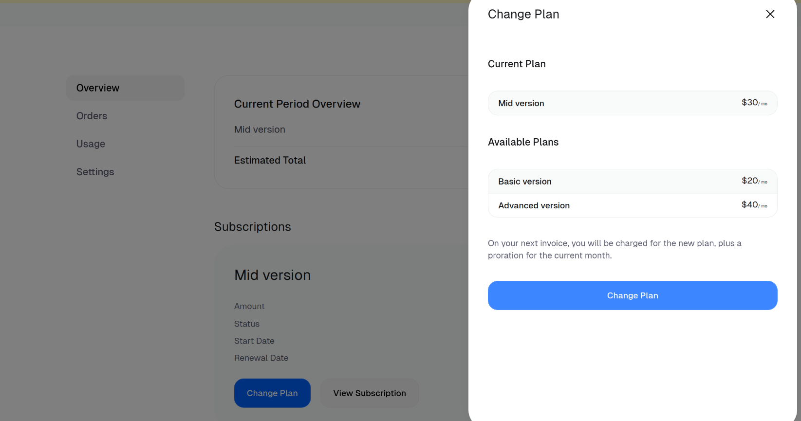 Note that merchants can disable customer-level upgrades or downgrades in the portal by toggling OFF Allow price change setting.